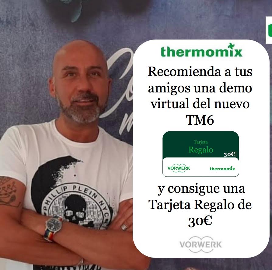 Hola¡¡ No dejes de conseguir una Tarjeta regalo como ésta de 30€ por sólo recomendar a un amigo que disfrute de una Demostración Virtual de nuestra nueva TM6. Ponte en contacto conmigo y te haré llegar un cupón para canjearlo en la Tienda online de Thermomix® y hacerte con múltiples accesorios para cocinar ó libros de tu preferencia.